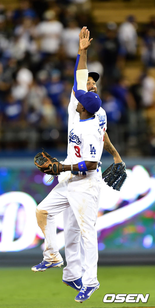 경기후 다저스 맷 켐프와 고든이 승리 하이파이브를 하고 있다./ jpnews@osen.co.kr