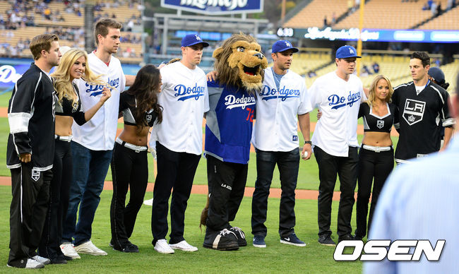 경기에 앞서 NHL 로스앤젤레스 킹스 선수들과 치어리더가 포즈를 취하고 있다./ jpnews@osen.co.kr