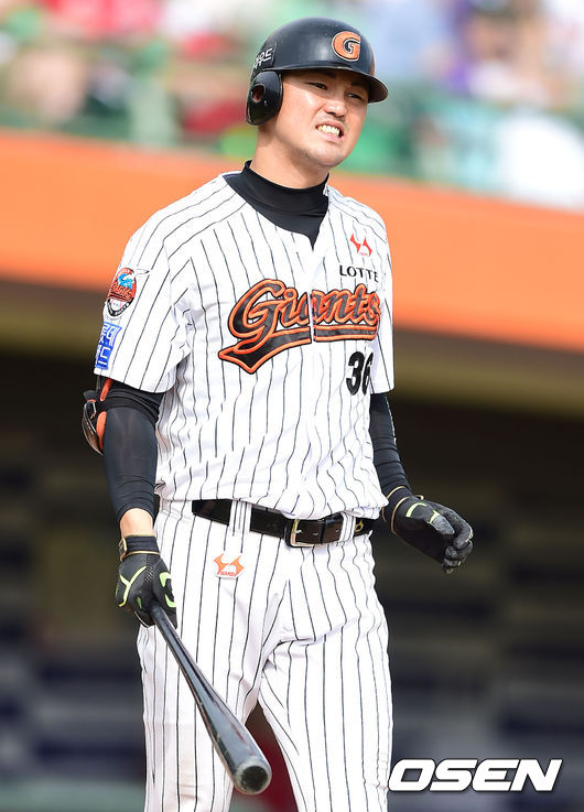 3회말 2사 만루, 박종윤이 플라이 아웃되자 아쉬운 표정을 짓고 있다.
