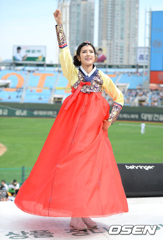 롯데 치어리더 박기량이 힘찬 응원을 펼치고 있다.