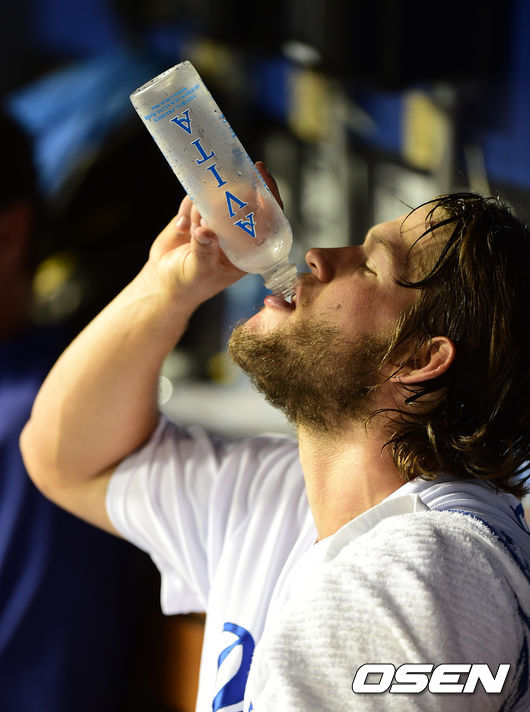 6회초 수비를 마친 다저스 커쇼가 더그아웃에서 물을 마시고 있다./ jpnews@osen.co.kr