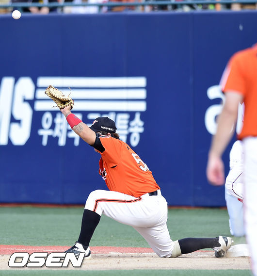 9일 오후 서울 목동구장에서 열린 '2014 한국야쿠르트 프로야구 세븐 프로야구' 넥센 히어로즈와 한화 이글스의 경기, 5회말 선두타자 넥센 박병호의 타격에 한화 1루수 김태균이 포구 중 공이 글러브에 맞고 팅겨 나가고 있다.