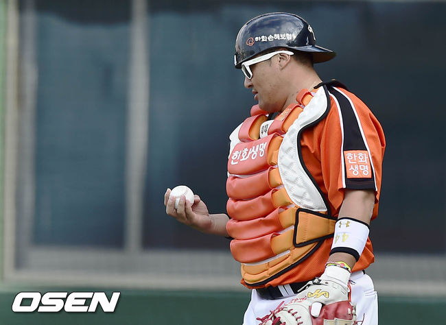 9일 오후 서울 목동구장에서 열린 '2014 한국야쿠르트 프로야구 세븐 프로야구' 넥센 히어로즈와 한화 이글스의 경기, 5회말 한화 정범모의 뒤를 이어 포수 마스크를 쓴 조인성이 폭투로 한점을 헌납하고 공을 바라 보고 있다.