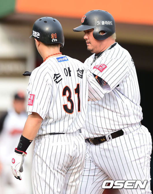 6회말 무사 2루 최준석의 투런포로 홈을 밟은 손아섭이 최준석과 기쁨의 인사를 나누고 있다.