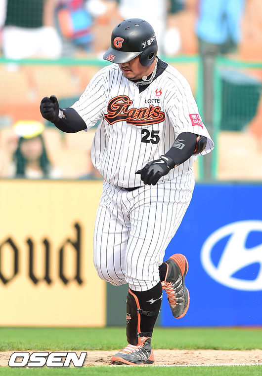 6회말 무사 2루 투런포를 날린 최준석이 그라운드를 돌며 세레모니를 하고 있다.