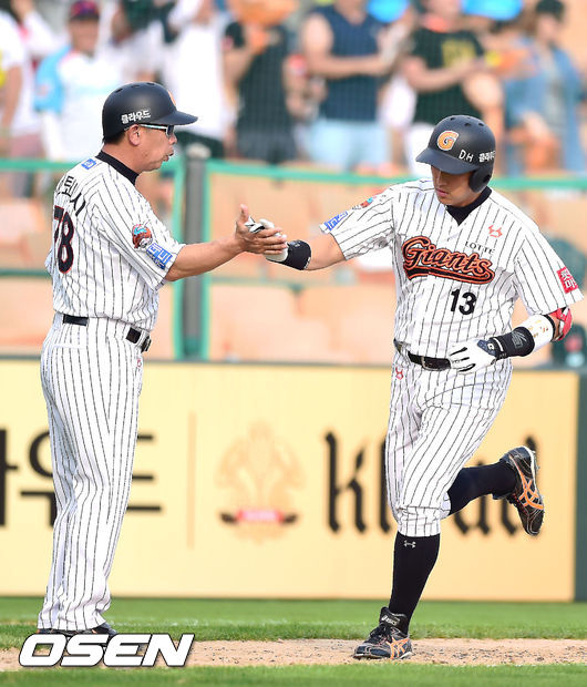 7회말 솔로포를 날린 황재균이 모토니시 코치와 하이파이브를 나누고 있다.
