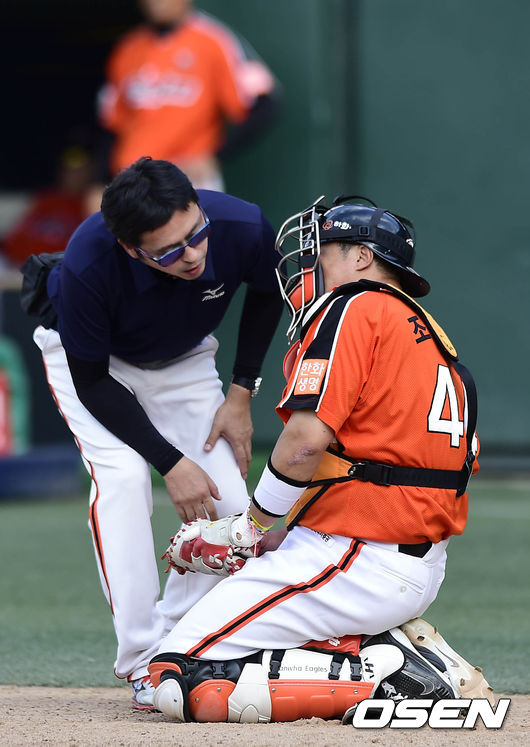 9일 오후 서울 목동구장에서 열린 '2014 한국야쿠르트 프로야구 세븐 프로야구' 넥센 히어로즈와 한화 이글스의 경기, 7회말 조인성이 박병호의 파울타구에 맞고 고통을 호소하고 있다.
