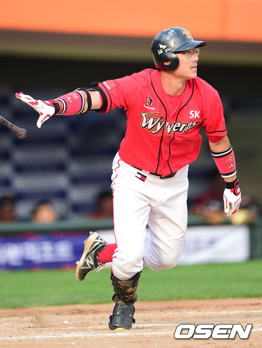 8회초 1사 1루 박정권이 우중간 2루타를 때리고 있다.