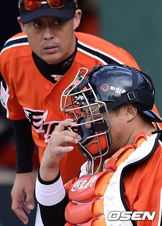 9일 오후 서울 목동구장에서 열린 '2014 한국야쿠르트 프로야구 세븐 프로야구' 넥센 히어로즈와 한화 이글스의 경기, 7회말 조인성이 박병호의 파울타구에 맞아 고통스러워하다 다시 포수 마스크를 쓰고 있다.