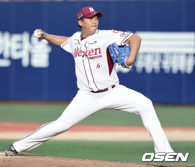 9일 오후 서울 목동구장에서 열린 '2014 한국야쿠르트 프로야구 세븐 프로야구' 넥센 히어로즈와 한화 이글스의 경기, 넥센 김영민이 9회에 마운드에 올라 힘차게 공을 던지고 있다.