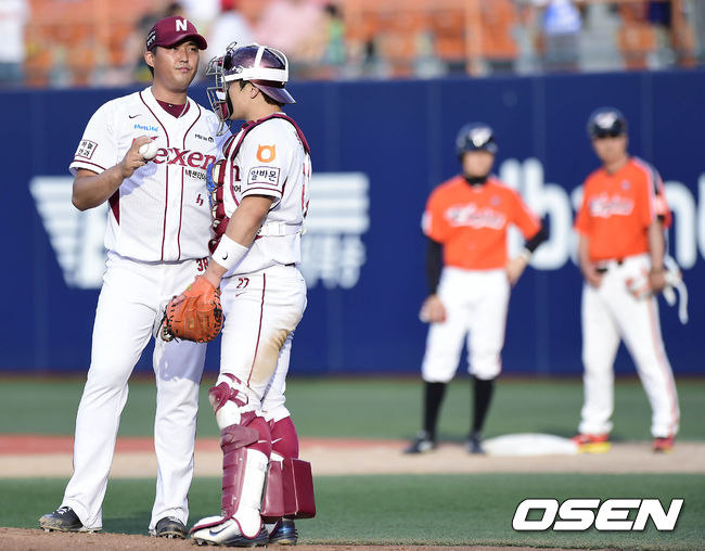 9일 오후 서울 목동구장에서 열린 '2014 한국야쿠르트 프로야구 세븐 프로야구' 넥센 히어로즈와 한화 이글스의 경기, 9회초 2아웃 이후 넥센 김영민이 안타와 볼넷으로 주자를 출루시키자 박동원이 마운드를 방문하고 있다.
