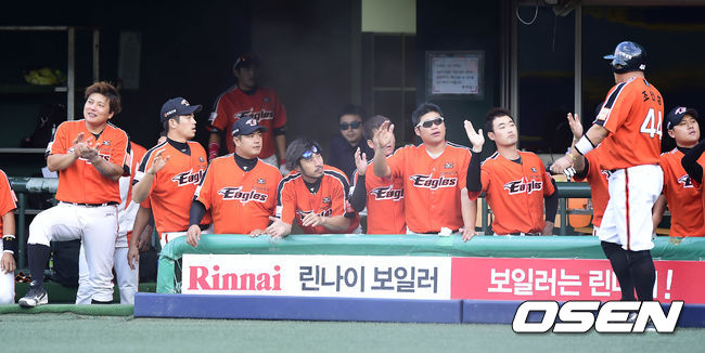 9일 오후 서울 목동구장에서 열린 '2014 한국야쿠르트 프로야구 세븐 프로야구' 넥센 히어로즈와 한화 이글스의 경기, 9회초에 4점을 몰아 친 한화 선수들이 기쁨을 나누고 있다.