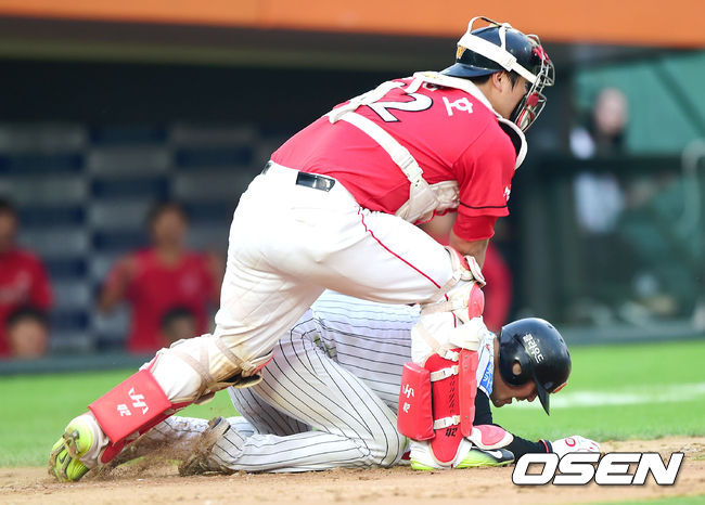 9회말 무사 1,3루 용덕한의 땅볼때 3루주자 박종윤이 홈을 파고들었지만 포수 정상호에 태그아웃되고 있다.