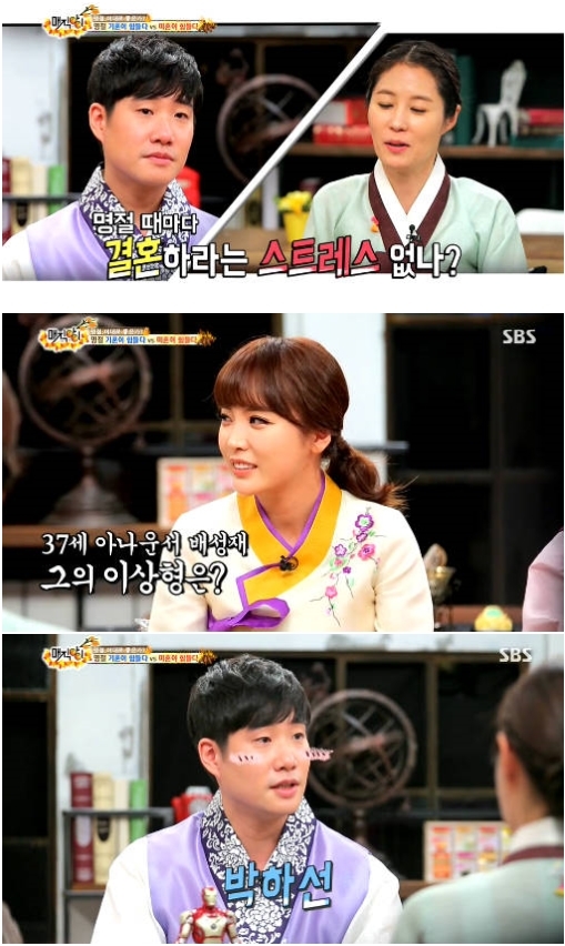 이어 MC 홍진경은 "연예인 중에 이상형이 있냐"고 물었고, 배성재 아나운서는 "이상형이 별로 없다"고 답했다. 이어지는 집요한 질문에 배성재 아나운서는 수줍게 "박하선씨"라고 말했다.