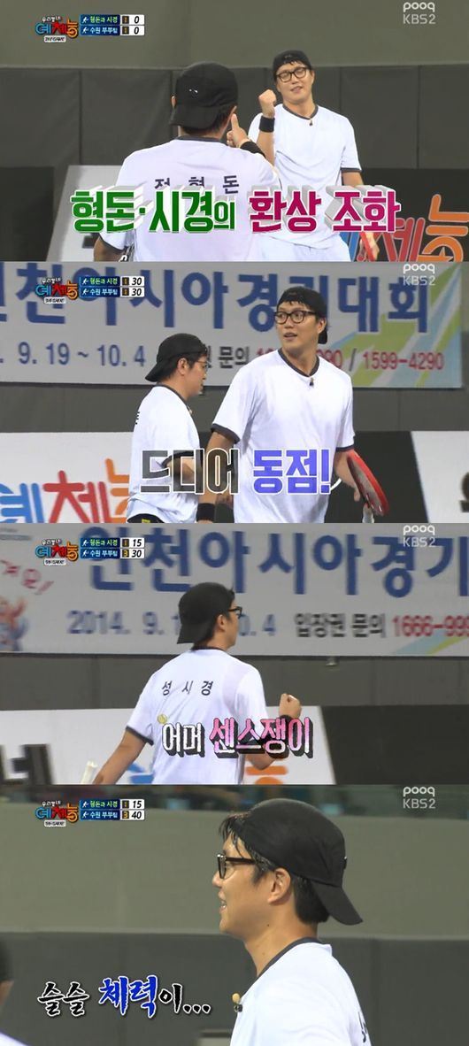 이날 성시경, 정형돈 조는 '수원' 테니스 팀의 부부조와 대결을 펼쳤다. 성시경은 시합 직전 근육부상을 당해 불안한 모습이었지만 코트에 들어선 성시경은 '테니스의 왕자'답게 실력을 뽐냈다.