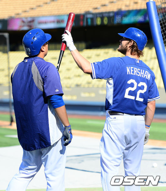 경기에 앞서 다저스 류현진이 배팅 훈련을 하며 커쇼의 배트를 살펴보고 있다.