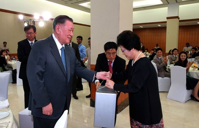 정몽구 회장이 7일(현지시간) 인도 공장을 방문해 신형 i20 차량 생산 라인을 둘러보고 관계자들과 의견을 나누고 있다. 아래 사진은 정몽구 회장이 주재원 및 가족들을 위한 격려 만찬 자리에서 한국에서 가져온 명절 선물을 직접 전달하는 장면. /현대자동차 제공.