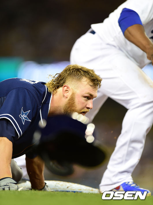 2회초 2사 1,3루에서 샌디에이고 캐쉬너가 선제 2타점 좌중간 적시 2루타를 날리고 볼이 빠진 틈을 노려 3루에서 슬라이딩 세이프되고 있다.