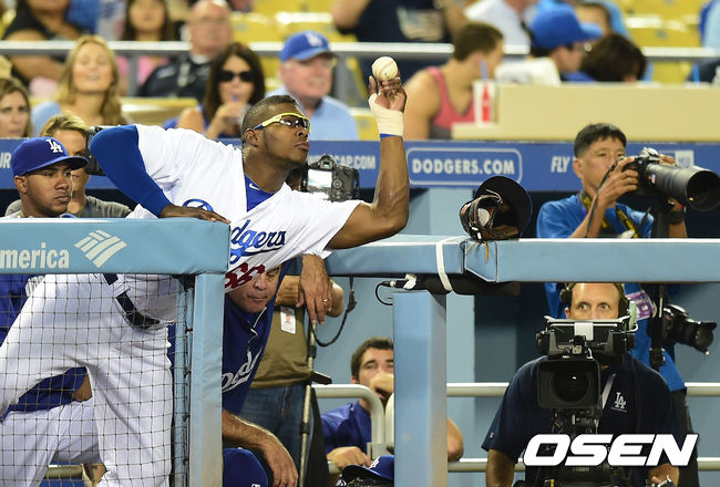1회말 1사에서 다저스 푸이그가 라미레즈의 파울볼을 더그아웃에서 맨손으로 잡고 있다.