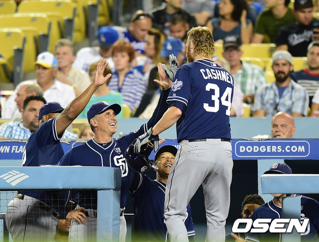 2회초 2사 3루에서 샌디에이고 캐쉬너가 스팽겐버그 1타점 중전 적시타에 홈을 밟으며 더그아웃에서 하이파이브를 하고 있다.