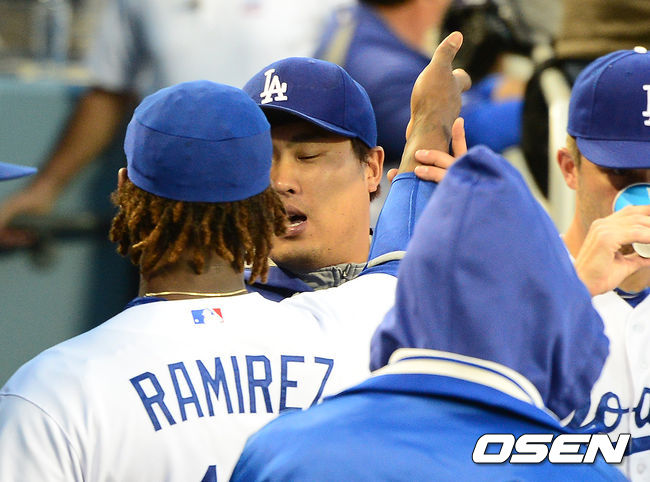 경기에 앞서 다저스 류현진이 라메레즈와 장난을 치고 있다.