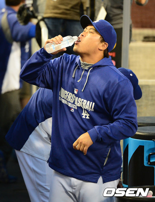 경기에 앞서 다저스 류현진이 물을 마시고 있다.