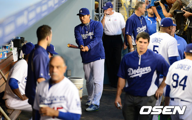 경기에 앞서 다저스 류현진이 유리베의 배트로 타격 자세를 취하고 있다.