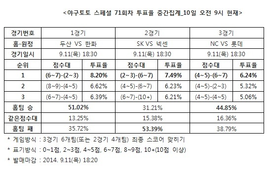 [야구토토] 국민체육진흥공단(www.kspo.or.kr)이 발행하는 체육진흥투표권 수탁사업자인 스포츠토토의 공식 온라인 발매 사이트 베트맨(www.betman.co.kr)이 오는 11일에 열리는 한국프로야구(KBO) 3경기를 대상으로 한 야구토토 스페셜 71회차 투표율을 중간 집계한 결과, SK-넥센(2경기)전에서 야구팬 53.39%는 넥센이 SK를 상대로 승리할 것이라 예상했다.