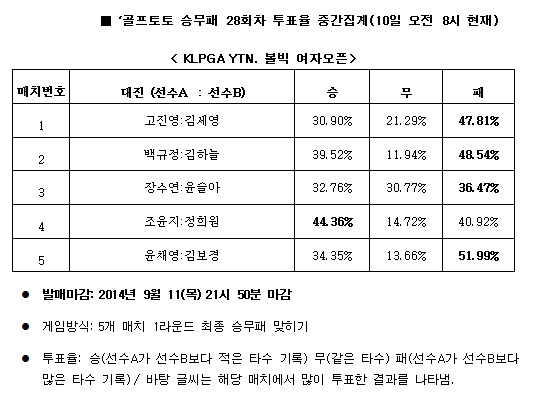 국민체육진흥공단(www.kspo.or.kr)이 발행하는 체육진흥투표권 수탁사업자인 스포츠토토 공식 온라인 발매 사이트인 베트맨(www.betman.co.kr)은 오는 12일에 코스카CC에서 열리는 'KLPGA YTN. 볼빅 여자오픈' 1라운드를 대상으로 한 골프토토 승무패 28회차 1번 매치에서 김세영(47.81%)이 고진영(30.90%)보다 좋은 성적을 기록할 것으로 예상했다고 밝혔다.