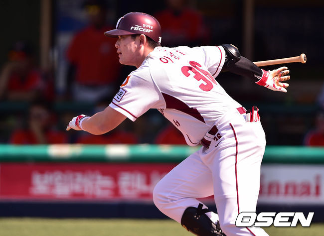 2회말 무사 2루에서 넥센 이성열이 중전 안타를 치고 있다.