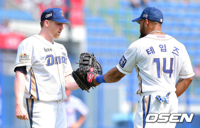 10일 오후 경남 창원시 마산구장에서 열린 2014 한국야쿠르트 세븐 프로야구 NC 다이노스와 삼성 라이온스의 경기,2회초 무사 1,2루 삼성 박해민의 번트타구를 호수비 펼친 NC 선발투수 에릭이 테임즈와 하이파이브를 하고 있다.