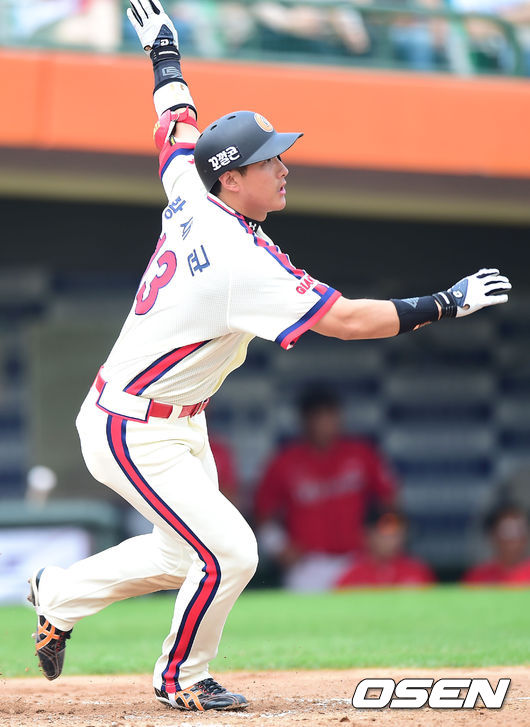 2회말 2사 2루 황재균이 1타점 2루타를 날리고 있다.