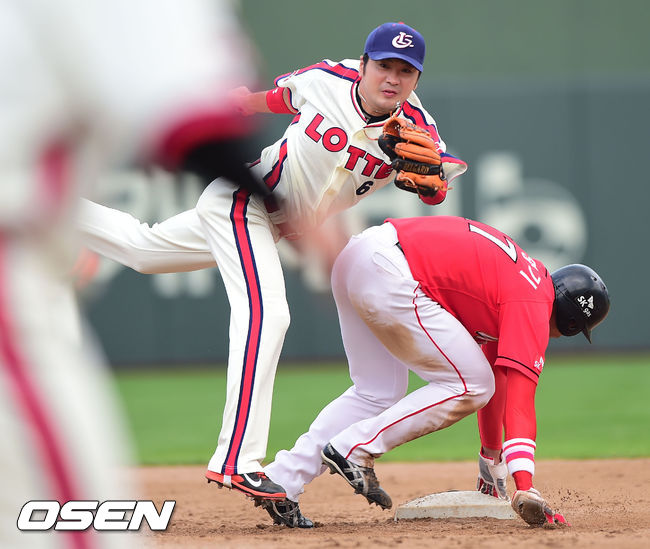 3회초 무사 1,2루 조동화 타석때 1루주자 이명기가 포스아웃되고 있다.