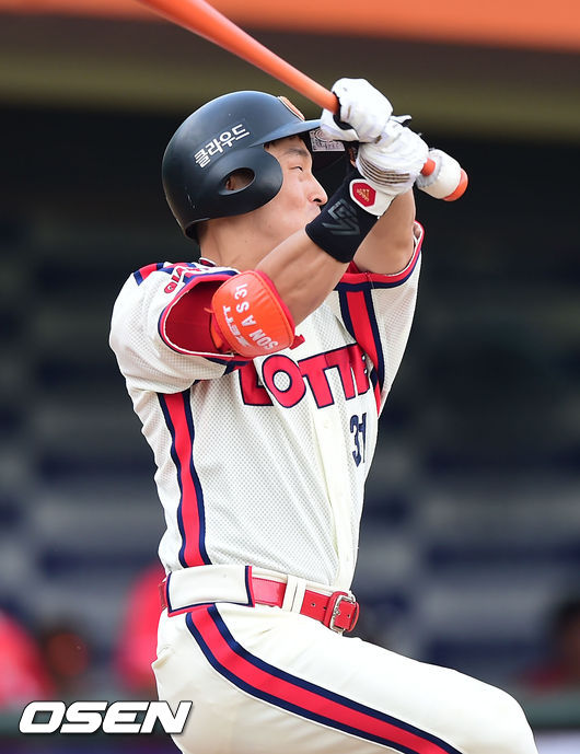 3회말 선두타자 손아섭이 좌익수 앞으로 떨어지는 2루타를 때리고 있다.