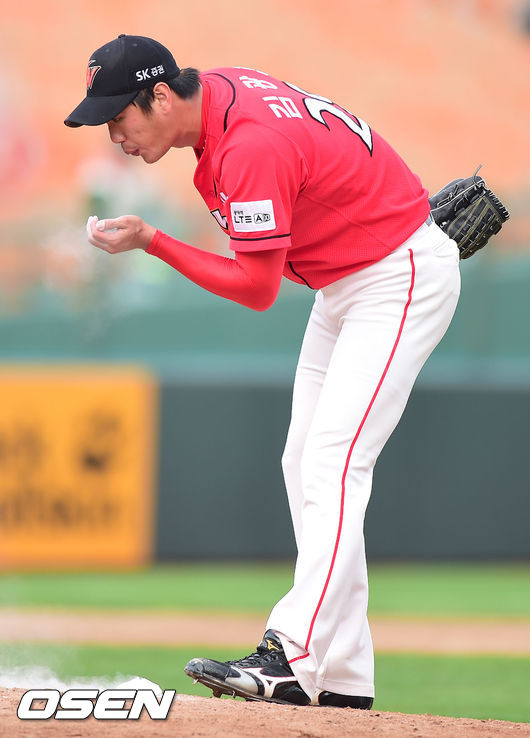 3회말 2사 2루 상황. 5실점한 김광현이 호흡을 가다듬고 있다.