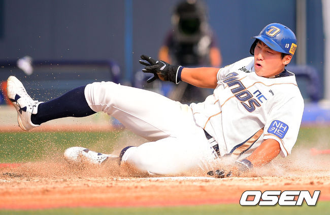 10일 오후 경남 창원시 마산구장에서 열린 2014 한국야쿠르트 세븐 프로야구 NC 다이노스와 삼성 라이온스의 경기,4회말 1사 2루 NC 이호준의 선취 1타점 적시타때 2루 주자 나성범이 홈에 세이프되고 있다.