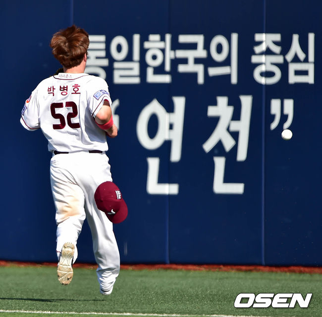 7회초 무사에서 넥센 박병호가 한화 송광민의 파울 타구를 따라가고 있다.