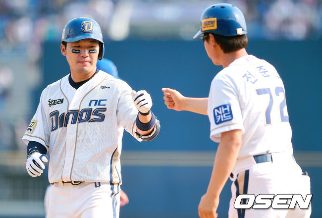 10일 오후 경남 창원시 마산구장에서 열린 2014 한국야쿠르트 세븐 프로야구 NC 다이노스와 삼성 라이온스의 경기,4회말 2사 1,3루 NC 지석훈이 1타점 적시타를 날린후 전준호 코치와 하이파이브를 하고 있다