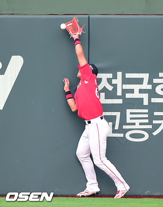 4회말 2사 1루 손아섭의 좌익수 뒤로 떨어지는 타구를 SK 한동민이 놓치고 있다.