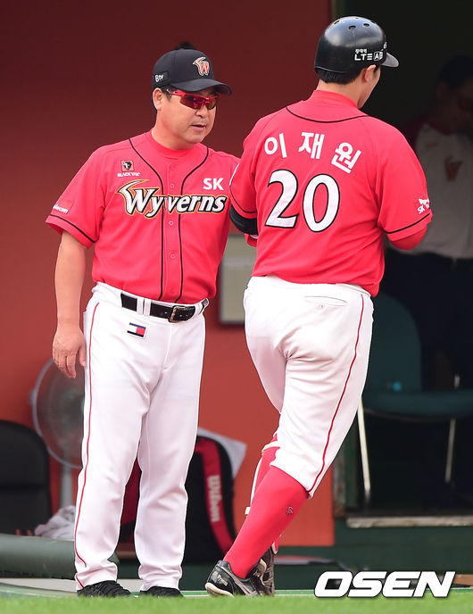 5회초 솔로포를 날린 선두타자 이재원이 덕아웃에서 이만수 감독과 하이파이브를 나누고 있다.