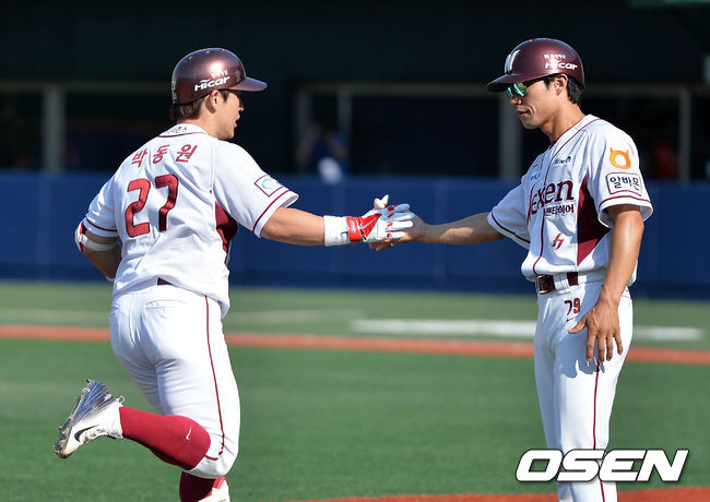7회말 무사에서 넥센 박동원이 중월 솔로 홈런을 치고 최만호 코치와 하이파이브를 하고 있다.