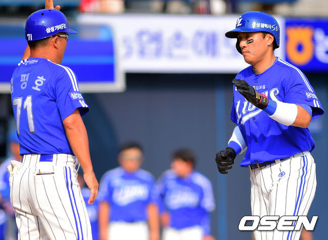 10일 오후 경남 창원시 마산구장에서 열린 2014 한국야쿠르트 세븐 프로야구 NC 다이노스와 삼성 라이온스의 경기,6회초 1사 삼성 이승엽이 솔로홈런을 날리고 김평호 코치와 하이파이브를 하고 있다.