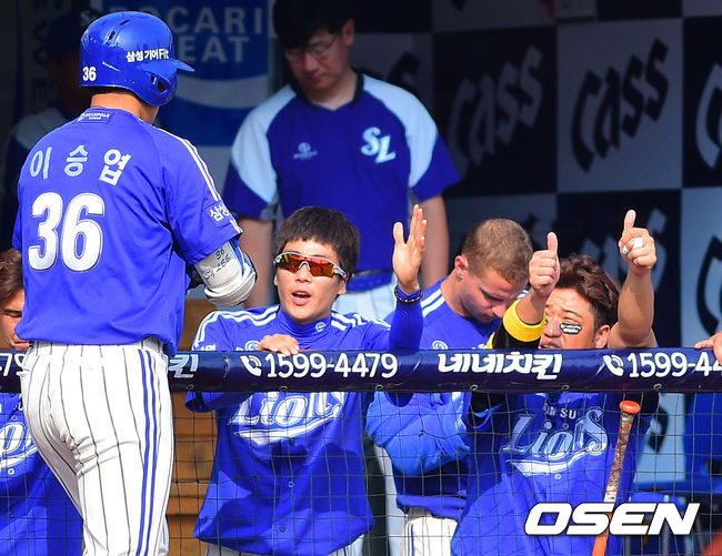 10일 오후 경남 창원시 마산구장에서 열린 2014 한국야쿠르트 세븐 프로야구 NC 다이노스와 삼성 라이온스의 경기,6회초 1사 삼성 이승엽이 솔로홈런을 날리고 동료들의 축하를 받고 있다.