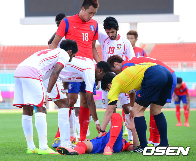 10일 오후 경기도 안산와스타디움에서 열린 아시안게임 대한민국 대표팀 과 UAE의 경기, 전반전 대한민국 윤일록이 상대선수와 충돌로 쓰러져 있다.