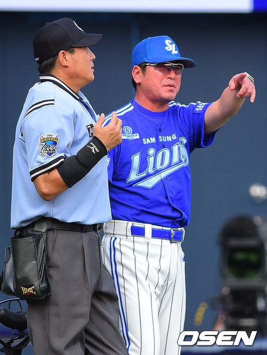 10일 오후 경남 창원시 마산구장에서 열린 2014 한국야쿠르트 세븐 프로야구 NC 다이노스와 삼성 라이온스의 경기, 7회말 2사 1루 NC 김종호 타석때 삼성 선발투수 마틴이 보크판정을 받았다. 삼성 류중일 감독이 이민호 구심에게 항의하고 있다.