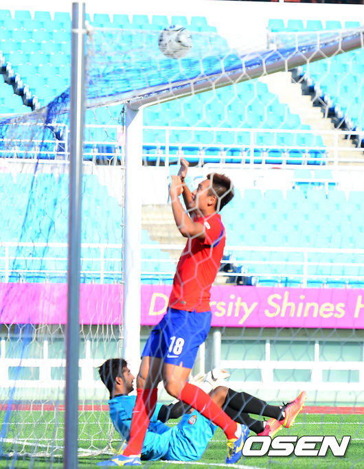 10일 오후 경기도 안산와스타디움에서 열린 아시안게임 대한민국 대표팀 과 UAE의 경기, 대한민국 김신욱이 골대를 벗어난 공을 보며 아쉬워 하고 있다.