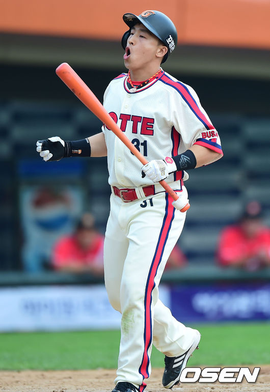 6회말 1사 만루 손아섭이 밀어내기 볼넷으로 1루로 출루하고 있다.