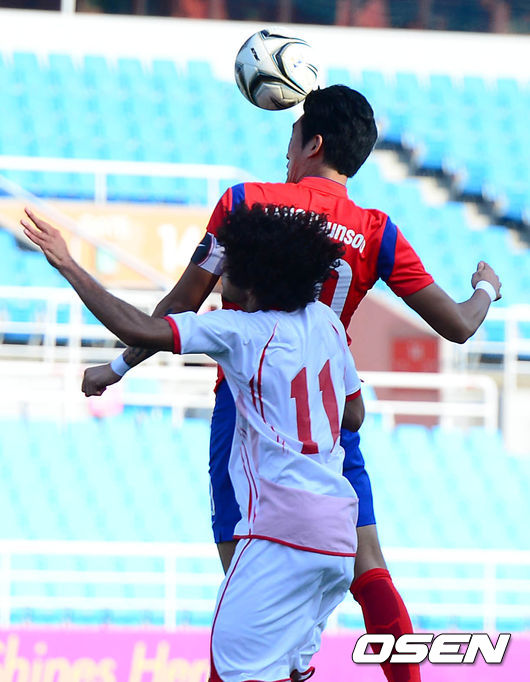 10일 오후 경기도 안산와스타디움에서 열린 아시안게임 대한민국 대표팀 과 UAE의 경기, 전반전 대한민국 장현수가 헤딩슛을 시도하고 있다.