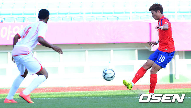 10일 오후 경기도 안산와스타디움에서 열린 아시안게임 대한민국 대표팀 과 UAE의 경기, 전반전 대한민국 정지훈이 슈팅을 하고 있다.