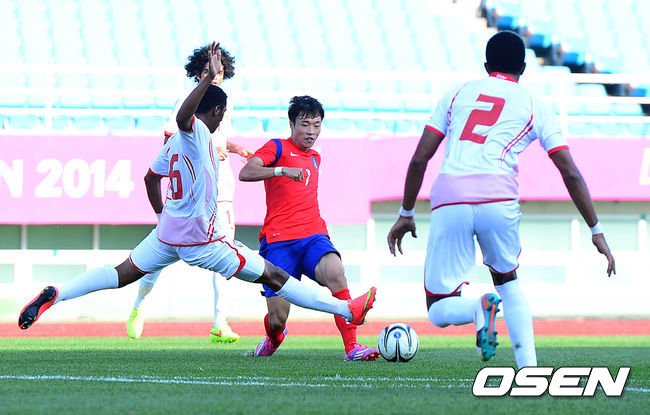 10일 오후 경기도 안산와스타디움에서 열린 아시안게임 대한민국 대표팀 과 UAE의 경기, 대한민국 안용우의 드리블을 상대 선수들이 수비하고 있다.